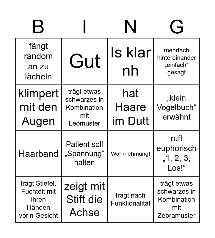 This bingo card has 19 words: Wahrnehmung!, Zuerst denken, Is klar nh, trägt etwas schwarzes in Kombination mit Zebramuster, ruft euphorisch „1, 2, 3, Los!“, klimpert mit den Augen, fragt nach Funktionalität, fängt random an zu lächeln, Gut, Haarband, Patient soll „Spannung“ halten, trägt etwas schwarzes in Kombination mit Leomuster, hat Haare im Dutt, zeigt mit Stift die Achse, trägt Stiefel, Fuchtelt mit ihren Händen vor‘n Gesicht, Oben, mehrfach hintereinander „einfach“ gesagt, „klein Vogelbuch“ erwähnt and „nicht kompliziert denken“.