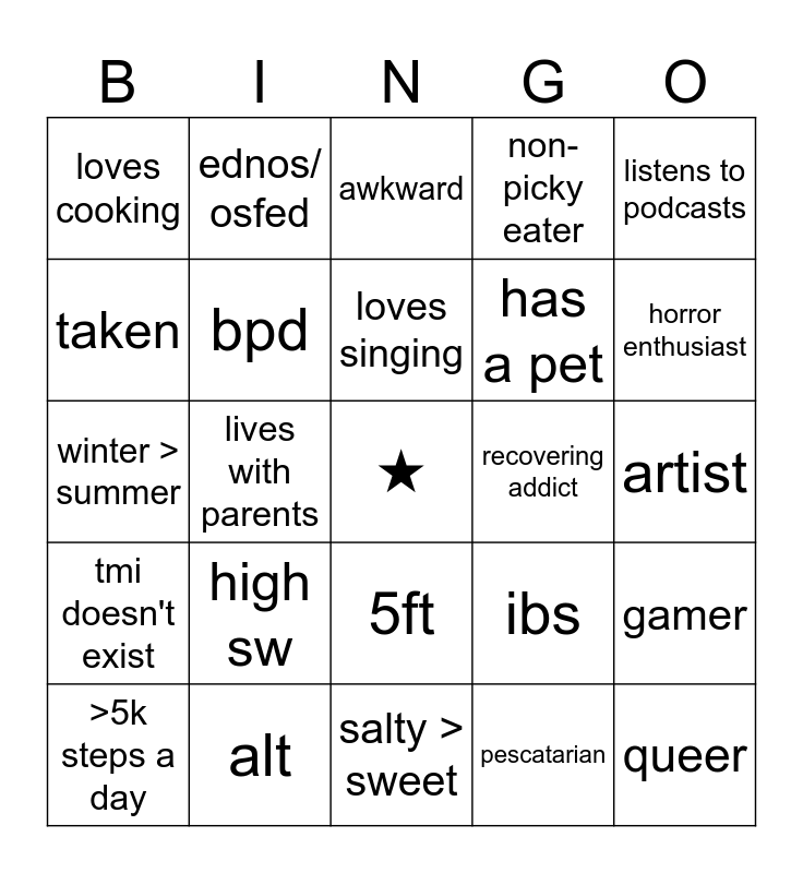 This bingo card has a free space and 24 words: high sw, alt, loves singing, >5k steps a day, listens to podcasts, loves cooking, taken, ednos/ osfed, recovering addict, 5ft, has a pet, winter > summer, ibs, gamer, bpd, pescatarian, artist, awkward, horror enthusiast, lives with parents, queer, tmi doesn't exist, non-picky eater and salty > sweet.