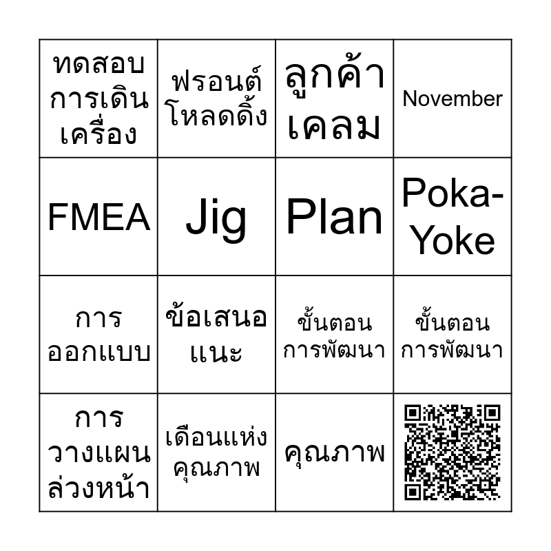 This bingo card has 1 images and 22 words: การสร้างชิ้นงานต้นแบบ, Poka-Yoke, ออกแบบ Layout, FMEA, ทดสอบการเดินเครื่อง, Jig, ฟรอนต์โหลดดิ้ง, การวางแผนล่วงหน้า, คู่มือปฏิบัติงาน, ข้อเสนอแนะ, การออกแบบ, ผลิตภัณฑ์ที่ดียื่งขึ้น, ต้นทุนลดลง, เดือนแห่งคุณภาพ, ป้องกันปัญหา, ลูกค้าเคลม, ขั้นตอนการพัฒนา, Plan, ขั้นตอนการพัฒนา, November, คุณภาพ and การมีส่วนร่วม.