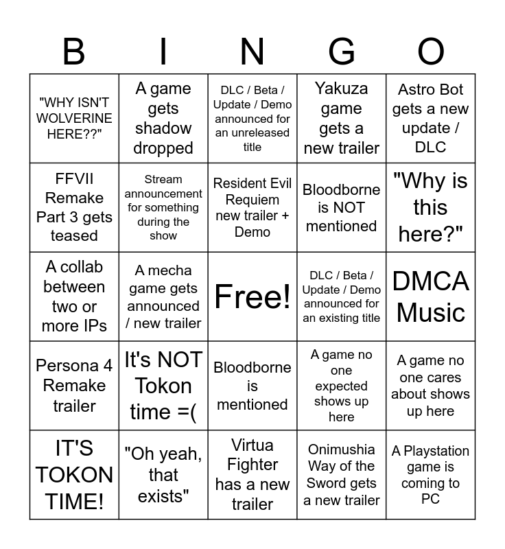 This bingo card has a free space and 24 words: IT'S TOKON TIME!, It's NOT Tokon time =(, Resident Evil Requiem new trailer + Demo, Onimushia Way of the Sword gets a new trailer, Astro Bot gets a new update / DLC, "WHY ISN'T WOLVERINE HERE??", A game gets shadow dropped, DLC / Beta / Update / Demo announced for an unreleased title, DLC / Beta / Update / Demo announced for an existing title, DMCA Music, A collab between two or more IPs, Stream announcement for something during the show, A game no one expected shows up here, A game no one cares about shows up here, FFVII Remake Part 3 gets teased, "Oh yeah, that exists", Virtua Fighter has a new trailer, Yakuza game gets a new trailer, "Why is this here?", Persona 4 Remake trailer, A mecha game gets announced / new trailer, Bloodborne is mentioned, Bloodborne is NOT mentioned and A Playstation game is coming to PC.