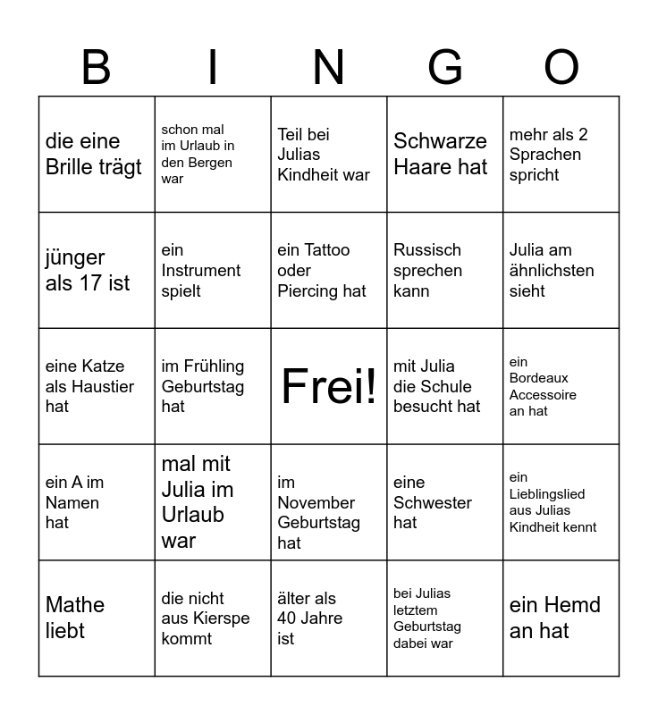 This bingo card has a free space and 24 words: mal mit Julia im Urlaub war, die nicht aus Kierspe kommt, ein Tattoo oder Piercing hat, Mathe liebt, mehr als 2 Sprachen spricht, die eine Brille trägt, jünger als 17 ist, schon mal im Urlaub in den Bergen war, mit Julia die Schule besucht hat, im November Geburtstag hat, Russisch sprechen kann, eine Katze als Haustier hat, eine Schwester hat, ein Lieblingslied aus Julias Kindheit kennt, ein Instrument spielt, bei Julias letztem Geburtstag dabei war, ein Bordeaux Accessoire an hat, Teil bei Julias Kindheit war, Julia am ähnlichsten sieht, im Frühling Geburtstag hat, ein Hemd an hat, ein A im Namen hat, Schwarze Haare hat and älter als 40 Jahre ist.