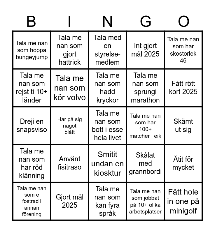 This bingo card has 25 words: Använt fisitraso, Tala me nan som kan fyra språk, Tala me nan som hadd kryckor, Tala me nan som e fostrad i annan förening, Tala me nan som har skostorlek 46, Tala me nan som hoppa bungeyjump, Tala me nan som rejst ti 10+ länder, Tala me nan som gjort hattrick, Tala me nan som har 100+ matcher i eik, Smitit undan en kiosktur, Tala me nan som sprungi marathon, Dreji en snapsviso, Skålat med grannbordi, Ätit för mycket, Tala me nan som kör volvo, Fått hole in one på minigolf, Skämt ut sig, Tala med en styrelse-medlem, Fått rött kort 2025, Har på sig något blått, Tala me nan som bott i esse hela livet, Gjort mål 2025, Tala me nan som har röd klänning, Int gjort mål 2025 and Tala me nan som jobbat på 10+ olika arbetsplatser.