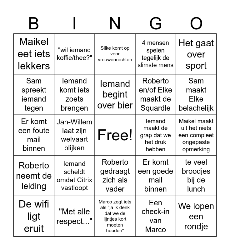 This bingo card has a free space and 24 words: Iemand scheldt omdat Citrix vastloopt, "Met alle respect...", Iemand begint over bier, De wifi ligt eruit, Het gaat over sport, Maikel eet iets lekkers, Sam spreekt iemand tegen, "wil iemand koffie/thee?", Iemand maakt de grap dat we het druk hebben, Roberto gedraagt zich als vader, Roberto en/of Elke maakt de Squardle, Er komt een foute mail binnen, Er komt een goede mail binnen, te veel broodjes bij de lunch, Iemand komt iets zoets brengen, Een check-in van Marco, Maikel maakt uit het niets een compleet ongepaste opmerking, Silke komt op voor vrouwenrechten, Sam maakt Elke belachelijk, Jan-Willem laat zijn welvaart blijken, We lopen een rondje, Roberto neemt de leiding, 4 mensen spelen tegelijk de slimste mens and Marco zegt iets als "ja ik denk dat we de lijntjes kort moeten houden".