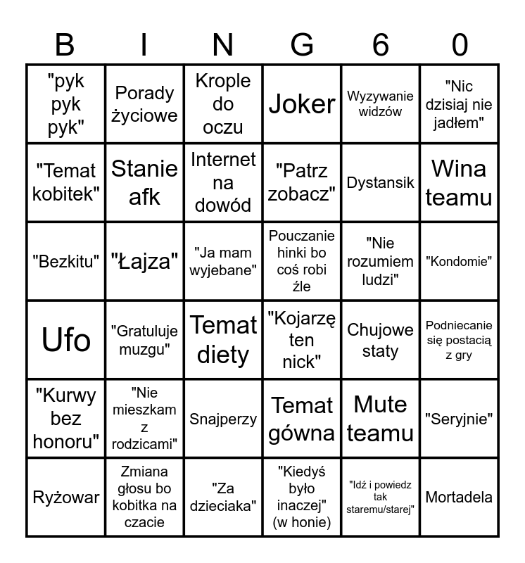This bingo card has 36 words: Temat gówna, Snajperzy, "Kiedyś było inaczej" (w honie), "Temat kobitek", Ufo, Pouczanie hinki bo coś robi źle, Stanie afk, "Za dzieciaka", Wyzywanie widzów, Mute teamu, Wina teamu, Joker, "Seryjnie", "Łajza", "Patrz zobacz", "pyk pyk pyk", "Kurwy bez honoru", "Nie rozumiem ludzi", "Bezkitu", Krople do oczu, "Ja mam wyjebane", "Gratuluje muzgu", "Kojarzę ten nick", Temat diety, Chujowe staty, Porady życiowe, Dystansik, Zmiana głosu bo kobitka na czacie, Internet na dowód, "Nic dzisiaj nie jadłem", Mortadela, Ryżowar, Podniecanie się postacią z gry, "Kondomie", "Nie mieszkam z rodzicami" and "Idź i powiedz tak staremu/starej".