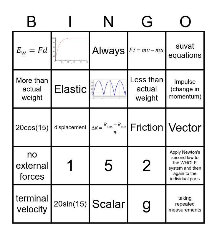 This bingo card has 10 images and 23 words: taking repeated measurements, change in velocity, displacement, The 1-2 Punch, no external forces, Elastic, suvat equations, terminal velocity, Always, Friction, Impulse (change in momentum), 20sin(15), 20cos(15), 1, 2, 5, Vector, Scalar, Less than actual weight, More than actual weight, Apply Newton's second law to the WHOLE system and then again to the individual parts, Velocity and g.
