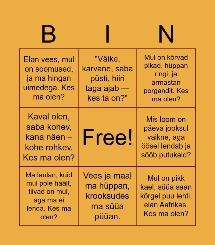 This bingo card has a free space and 8 words: Mis loom on päeva jooksul vaikne, aga öösel lendab ja sööb putukaid?, Mul on kõrvad pikad, hüppan ringi, ja armastan porgandit. Kes ma olen?, "Väike, karvane, saba püsti, hiiri taga ajab — kes ta on?", Ma laulan, kuid mul pole häält, tiivad on mul, aga ma ei lenda. Kes ma olen?, Elan vees, mul on soomused, ja ma hingan uimedega. Kes ma olen?, Mul on pikk kael, süüa saan kõrgel puu lehti, elan Aafrikas. Kes ma olen?, Kaval olen, saba kohev, kana näen – kohe rohkev. Kes ma olen? and Vees ja maal ma hüppan, krooksudes ma süüa püüan..