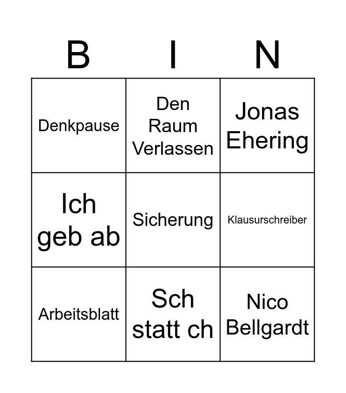 This bingo card has a free space and 8 words: Klausurschreiber, Jonas Ehering, Den Raum Verlassen, Arbeitsblatt, Denkpause, Nico Bellgardt, Ich geb ab and Sch statt ch.