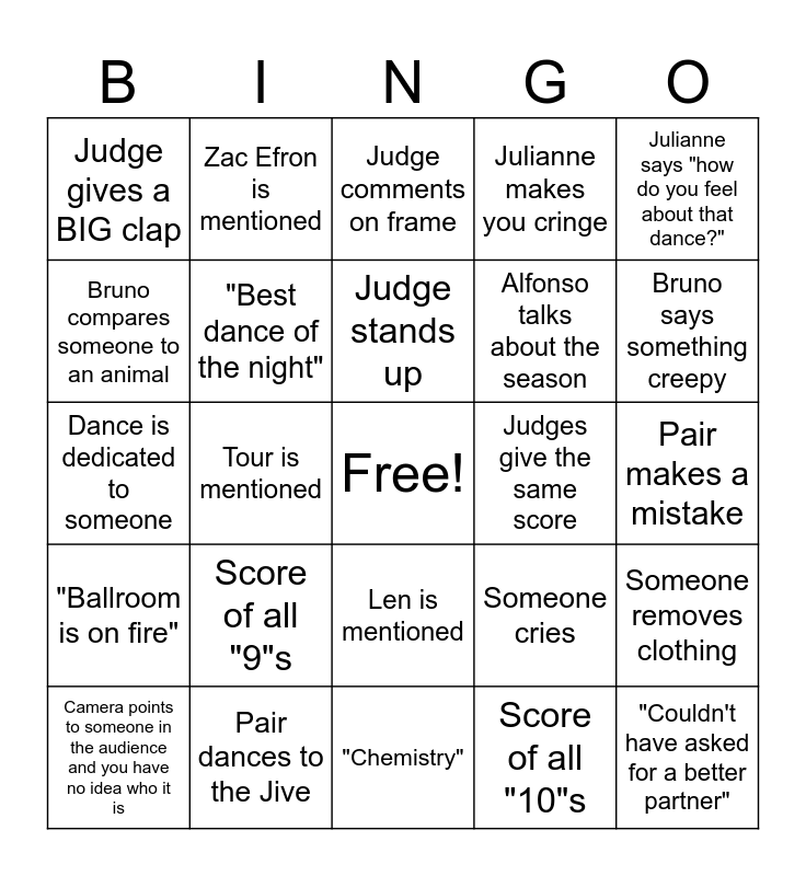 This bingo card has a free space and 24 words: Score of all "9"s, Pair dances to the Jive, Judge stands up, Camera points to someone in the audience and you have no idea who it is, Julianne says "how do you feel about that dance?", Judge gives a BIG clap, Bruno compares someone to an animal, Zac Efron is mentioned, Judges give the same score, Len is mentioned, Alfonso talks about the season, Dance is dedicated to someone, Someone cries, Someone removes clothing, "Best dance of the night", Score of all "10"s, Pair makes a mistake, Judge comments on frame, Bruno says something creepy, Tour is mentioned, "Couldn't have asked for a better partner", "Ballroom is on fire", Julianne makes you cringe and "Chemistry".