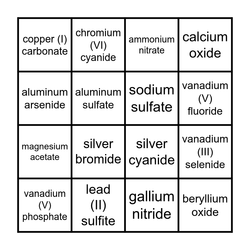 This bingo card has 32 words: copper (II) chloride, lithium acetate, vanadium (III) selenide, manganese (IV) nitride, beryllium oxide, sodium sulfate, aluminum arsenide, potassium chromate, chromium (VI) cyanide, tin (II) sulfate, vanadium (V) fluoride, ammonium nitrate, sodium phosphide, magnesium nitrate, lead (II) sulfite, calcium phosphate, ammonium sulfate, silver cyanide, aluminum sulfide, beryllium chloride, copper (I) arsenide, iron (III) oxide, gallium nitride, iron (II) bromide, vanadium (V) phosphate, calcium oxide, magnesium acetate, aluminum sulfate, copper (I) carbonate, barium oxide, ammonium sulfite and silver bromide.