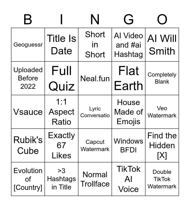 This bingo card has 25 words: Exactly 67 Likes, Normal Trollface, Neal.fun, Evolution of [Country], AI Will Smith, Geoguessr, Uploaded Before 2022, Title Is Date, House Made of Emojis, Capcut Watermark, Flat Earth, Vsauce, Windows BFDI, Find the Hidden [X], Full Quiz, Double TikTok Watermark, Veo Watermark, Short in Short, Completely Blank, 1:1 Aspect Ratio, Lyric Conversatio, >3 Hashtags in Title, Rubik's Cube, AI Video and #ai Hashtag and TikTok AI Voice.