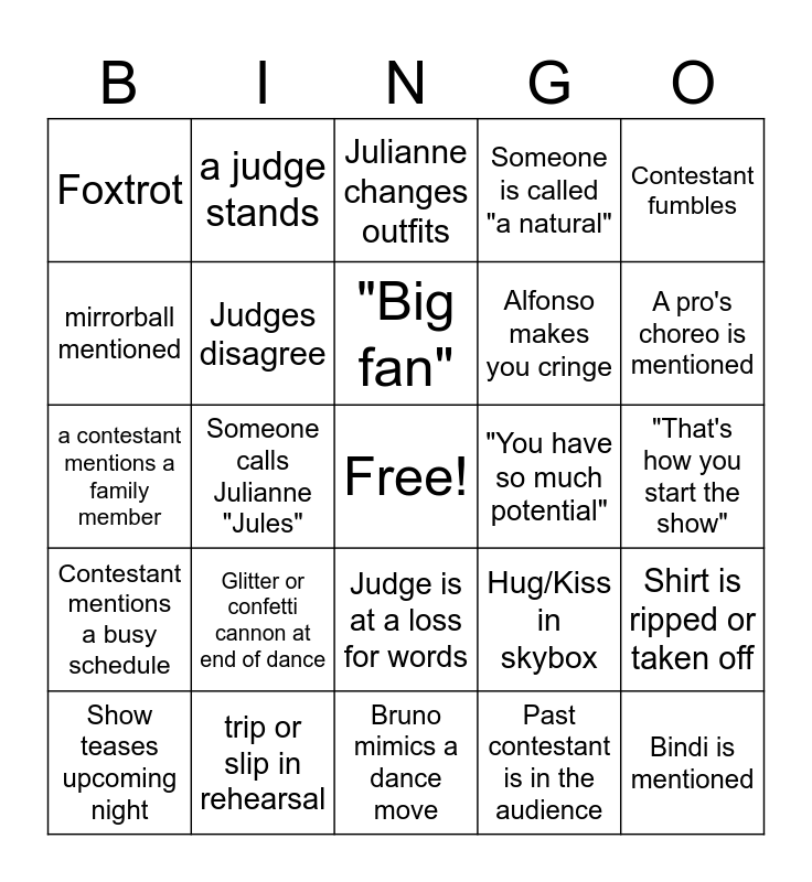 This bingo card has a free space and 24 words: Glitter or confetti cannon at end of dance, trip or slip in rehearsal, "Big fan", Show teases upcoming night, Contestant fumbles, Foxtrot, mirrorball mentioned, a judge stands, "You have so much potential", Judge is at a loss for words, Alfonso makes you cringe, a contestant mentions a family member, Hug/Kiss in skybox, Shirt is ripped or taken off, Judges disagree, Past contestant is in the audience, "That's how you start the show", Julianne changes outfits, A pro's choreo is mentioned, Someone calls Julianne "Jules", Bindi is mentioned, Contestant mentions a busy schedule, Someone is called "a natural" and Bruno mimics a dance move.