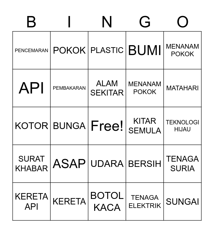 This bingo card has a free space and 24 words: ASAP, KERETA, ALAM SEKITAR, KERETA API, MENANAM POKOK, PENCEMARAN, API, POKOK, KITAR SEMULA, UDARA, MENANAM POKOK, KOTOR, BERSIH, TENAGA SURIA, PEMBAKARAN, TENAGA ELEKTRIK, TEKNOLOGI HIJAU, PLASTIC, MATAHARI, BUNGA, SUNGAI, SURAT KHABAR, BUMI and BOTOL KACA.