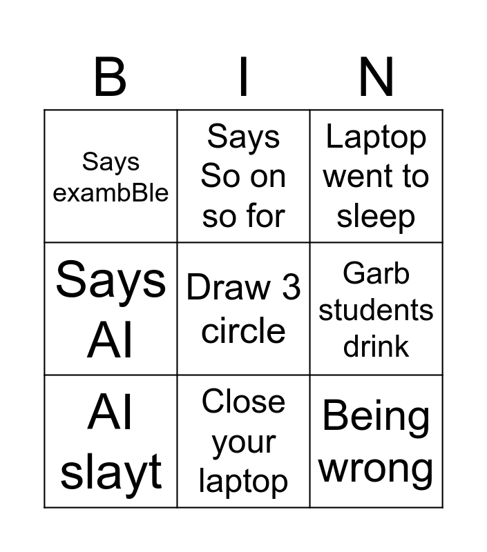 This bingo card has a free space and 8 words: Garb students drink, Laptop went to sleep, Says So on so for, AI slayt, Says exambBle, Being wrong, Says AI and Close your laptop.
