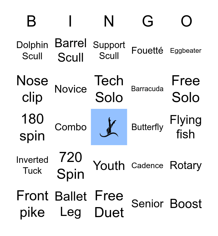 This bingo card has a free space and 70 words: Vertical, Flying fish, Bent knee vertical, 360 Spin, Ballet Leg, Sail Boat, Fouetté, Whip Kick, Eggbeater, Arm boost, Rotary, Torpedo, Dolphin Scull, Support Scull, Tech Duet, Combo, Youth, Barracuda, Split, Inverted Tuck, Butterfly, Cadence, Free Solo, Competitor, Hybrid, Element, Acro, Flamingo Bent Knee, Senior, Saturn, Barrel Scull, Surface Arch, Airborne Weight, Knight, Rio, Music, Swim through, Cyclone, Figures, Nose clip, Half Twist, 720 Spin, Boost, Stretch, Free team, Novice, Front pike, Fishtail, Junior, 12&Under, Masters, Ariana, Water Drop, Mixed Duet, Free Duet, Tech Team, Tech Solo, Tabletop, Connected Action, Point, 180 spin, Double Arm, Patterns, Foot First Scull, Head First Scull, Judges, Tapping, Back Layout, Front Layout and Coaches.