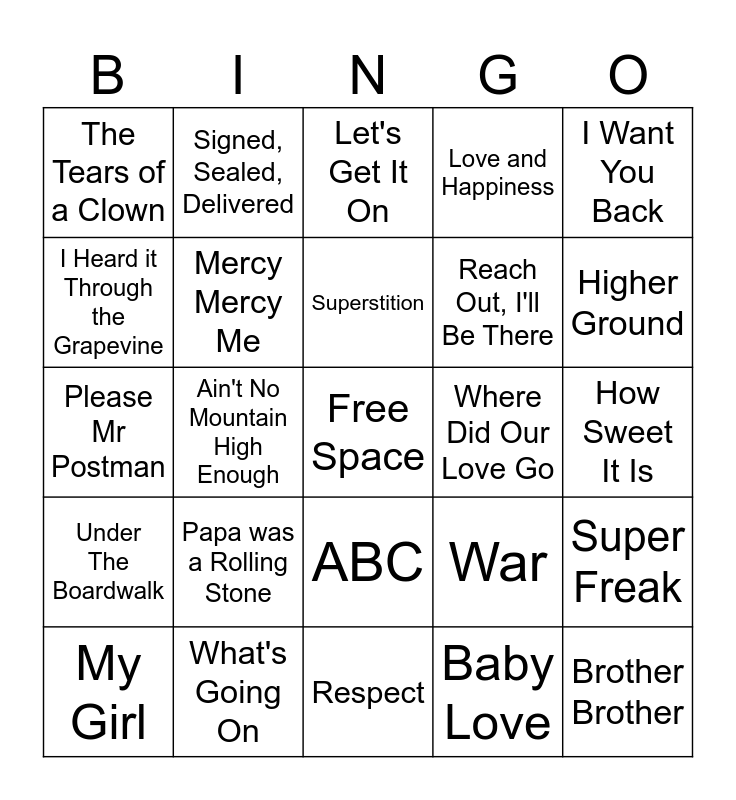 This bingo card has a free space and 24 words: Papa was a Rolling Stone, What's Going On, Superstition, My Girl, I Want You Back, The Tears of a Clown, I Heard it Through the Grapevine, Signed, Sealed, Delivered, Where Did Our Love Go, ABC, Reach Out, I'll Be There, Please Mr Postman, War, Super Freak, Mercy Mercy Me, Baby Love, How Sweet It Is, Let's Get It On, Higher Ground, Ain't No Mountain High Enough, Brother Brother, Under The Boardwalk, Love and Happiness and Respect.