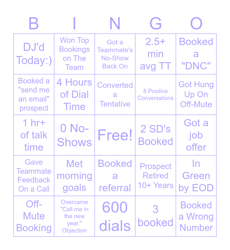 This bingo card has a free space and 29 words: Off-Mute Booking, Booked a competitor user, 0 No-Shows, 10min+ call (booked), DJ'd Today:), Got a Teammate's No-Show Back On, 4 Hours of Dial Time, Met morning goals, 2 SD's Booked, Overcame "Call me in the new year." Objection, Got a job offer, Booked a Wrong Number, 600 dials, 3 booked, Got Hung Up On Off-Mute, Same Day Hold, Booked a referral, Gave Teammate Feedback On a Call, Booked a "DNC", 1 hr+ of talk time, Prospect Retired 10+ Years, Made a prospect laugh, 8 Positive Conversations, Booked a "send me an email" prospect, 2.5+ min avg TT, Won Top Bookings on The Team, In Green by EOD, Converted a Tentative and Booked a "not a decision maker" prospect.