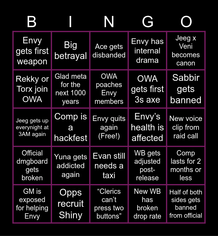 This bingo card has a free space and 24 words: Yuna gets addicted again, Opps recruit Shiny, OWA poaches Envy members, GM is exposed for helping Envy, Jeeg x Veni becomes canon, Envy gets first weapon, Rekky or Torx join OWA, Big betrayal, Envy’s health is affected, Evan still needs a taxi, OWA gets first 3s axe, Jeeg gets up everynight at 3AM again, WB gets adjusted post-release, Comp lasts for 2 months or less, Glad meta for the next 1000 years, New WB has broken drop rate, New voice clip from raid call, Ace gets disbanded, Sabbir gets banned, Comp is a hackfest, Half of both sides gets banned from official, Official dmgboard gets broken, Envy has internal drama and “Clerics can’t press two buttons”.