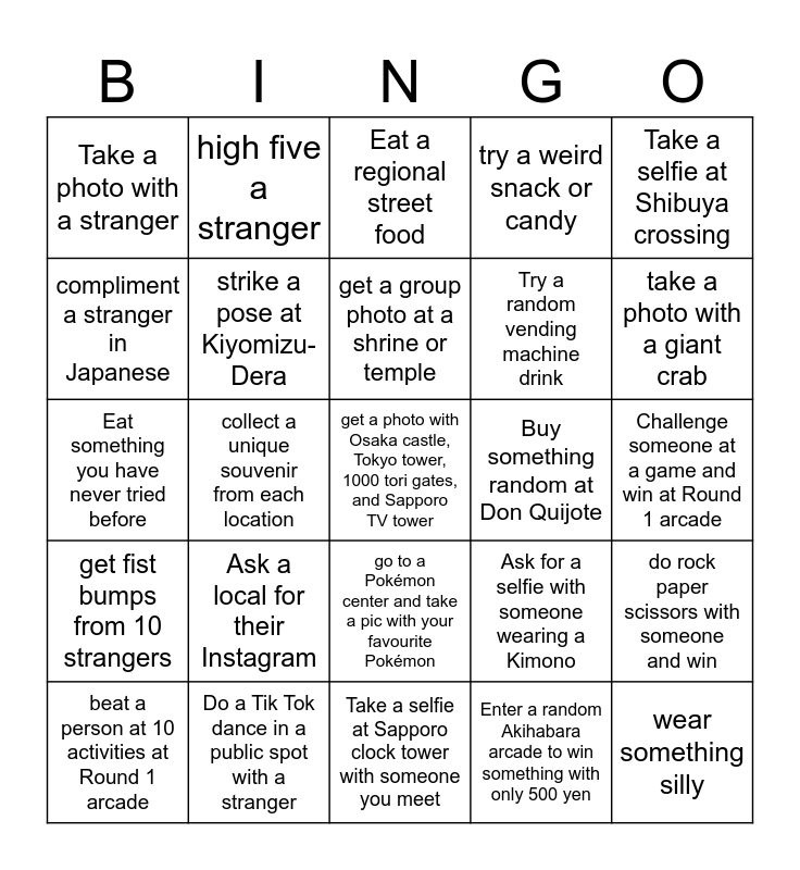 This bingo card has a free space and 24 words: Ask a local for their Instagram, Do a Tik Tok dance in a public spot with a stranger, get a group photo at a shrine or temple, beat a person at 10 activities at Round 1 arcade, Take a selfie at Shibuya crossing, Take a photo with a stranger, compliment a stranger in Japanese, high five a stranger, Buy something random at Don Quijote, go to a Pokémon center and take a pic with your favourite Pokémon, Try a random vending machine drink, Eat something you have never tried before, Ask for a selfie with someone wearing a Kimono, do rock paper scissors with someone and win, strike a pose at Kiyomizu-Dera, Enter a random Akihabara arcade to win something with only 500 yen, Challenge someone at a game and win at Round 1 arcade, Eat a regional street food, take a photo with a giant crab, collect a unique souvenir from each location, wear something silly, get fist bumps from 10 strangers, try a weird snack or candy and Take a selfie at Sapporo clock tower with someone you meet.