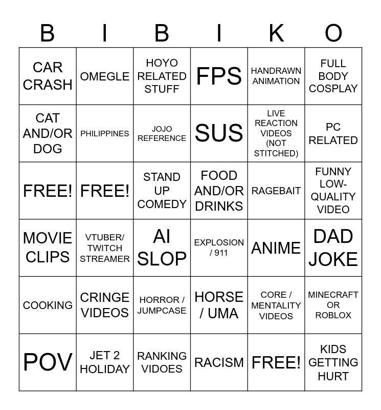 This bingo card has 36 words: HORSE / UMA, HORROR / JUMPCASE, RACISM, CAT AND/OR DOG, MOVIE CLIPS, FOOD AND/OR DRINKS, PHILIPPINES, RANKING VIDOES, HANDRAWN ANIMATION, CORE / MENTALITY VIDEOS, PC RELATED, FPS, MINECRAFT OR ROBLOX, FREE!, SUS, CAR CRASH, COOKING, RAGEBAIT, FREE!, HOYO RELATED STUFF, STAND UP COMEDY, VTUBER/ TWITCH STREAMER, EXPLOSION / 911, AI SLOP, ANIME, OMEGLE, LIVE REACTION VIDEOS (NOT STITCHED), JET 2 HOLIDAY, JOJO REFERENCE, FULL BODY COSPLAY, KIDS GETTING HURT, POV, DAD JOKE, FUNNY LOW-QUALITY VIDEO, CRINGE VIDEOS and FREE!.