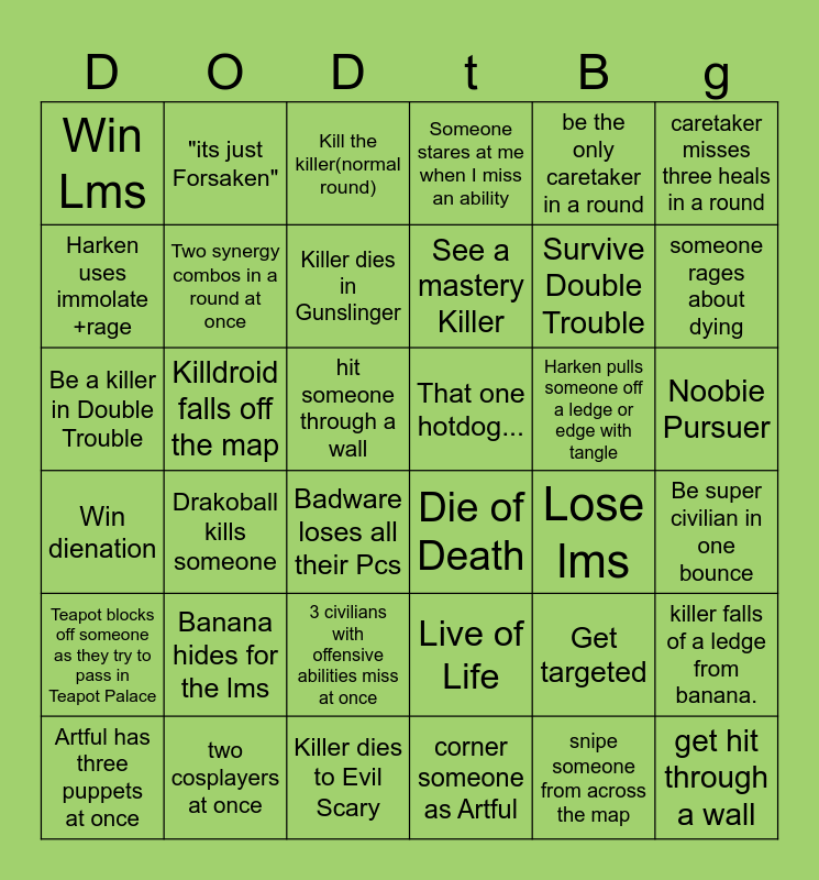 This bingo card has 36 words: Win dienation, Drakoball kills someone, Killer dies to Evil Scary, See a mastery Killer, Harken pulls someone off a ledge or edge with tangle, Noobie Pursuer, Win Lms, two cosplayers at once, Kill the killer(normal round), Live of Life, Survive Double Trouble, caretaker misses three heals in a round, Teapot blocks off someone as they try to pass in Teapot Palace, Killdroid falls off the map, Killer dies in Gunslinger, Someone stares at me when I miss an ability, Get targeted, Be super civilian in one bounce, Harken uses immolate +rage, Two synergy combos in a round at once, Badware loses all their Pcs, Die of Death, Lose lms, killer falls of a ledge from banana., Be a killer in Double Trouble, "its just Forsaken", hit someone through a wall, corner someone as Artful, be the only caretaker in a round, someone rages about dying, Artful has three puppets at once, Banana hides for the lms, 3 civilians with offensive abilities miss at once, That one hotdog..., snipe someone from across the map and get hit through a wall.