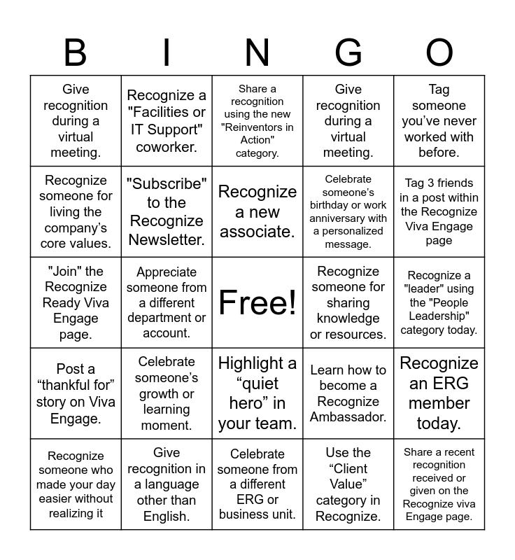 This bingo card has a free space and 29 words: Recognize someone who made your day easier without realizing it, Recognize a colleague in a different time zone., Appreciate someone from a different department or account., Send a handwritten thank-you note to a colleague., Give recognition during a virtual meeting., Share a recognition using the new "Reinventors in Action" category., "Subscribe" to the Recognize Newsletter., Celebrate someone’s growth or learning moment., Recognize someone for sharing knowledge or resources., Give recognition in a language other than English., Recognize a "leader" using the "People Leadership" category today., Share a recent recognition received or given on the Recognize viva Engage page., Celebrate someone from a different ERG or business unit., Use the “Client Value” category in Recognize., Tag 3 friends in a post within the Recognize Viva Engage page, Use Recognize to spotlight a global tradition or holiday., Highlight a “quiet hero” in your team., Post a “thankful for” story on Viva Engage., Tag someone you’ve never worked with before., "Join" the Recognize Ready Viva Engage page., Learn how to become a Recognize Ambassador., Recognize someone who helped you outside their usual role., Celebrate someone’s birthday or work anniversary with a personalized message., Recognize someone for living the company’s core values., Give recognition during a virtual meeting., Recognize a "Facilities or IT Support" coworker., Recognize an ERG member today., Recognize a new associate. and Recognize someone for a life event, such as birthday, service anniversary, new baby, etc..