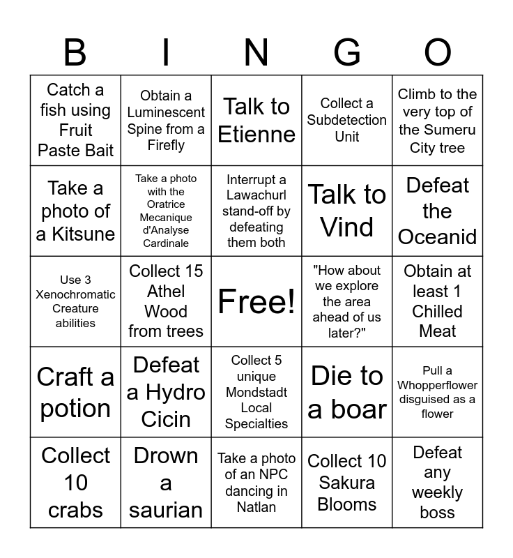 This bingo card has a free space and 24 words: Defeat a Hydro Cicin, Drown a saurian, Interrupt a Lawachurl stand-off by defeating them both, Collect 10 crabs, Climb to the very top of the Sumeru City tree, Catch a fish using Fruit Paste Bait, Take a photo of a Kitsune, Obtain a Luminescent Spine from a Firefly, "How about we explore the area ahead of us later?", Collect 5 unique Mondstadt Local Specialties, Talk to Vind, Use 3 Xenochromatic Creature abilities, Die to a boar, Pull a Whopperflower disguised as a flower, Take a photo with the Oratrice Mecanique d'Analyse Cardinale, Collect 10 Sakura Blooms, Obtain at least 1 Chilled Meat, Talk to Etienne, Defeat the Oceanid, Collect 15 Athel Wood from trees, Defeat any weekly boss, Craft a potion, Collect a Subdetection Unit and Take a photo of an NPC dancing in Natlan.