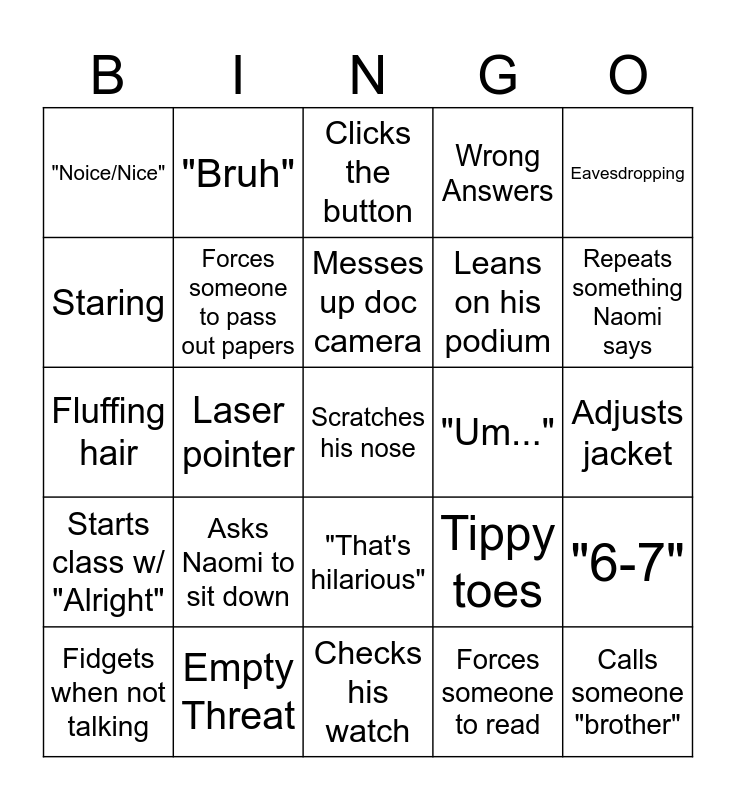 This bingo card has 28 words: "6-7", Sports talk, Leans on his podium, Forces someone to read, Staring, Clicks the button, "Bruh", Starts class w/ "Alright", "Um...", Fidgets when not talking, Fluffing hair, Wrong Answers, Empty Threat, Checks his watch, Repeats something Naomi says, Cackles at a dumb joke, Asks Naomi to sit down, Forces someone to pass out papers, Messes up doc camera, "That's hilarious", "Noice/Nice", Calls someone "brother", Scratches his nose, Laser pointer, Adjusts jacket, Tippy toes, Eavesdropping and Says something Cringy.