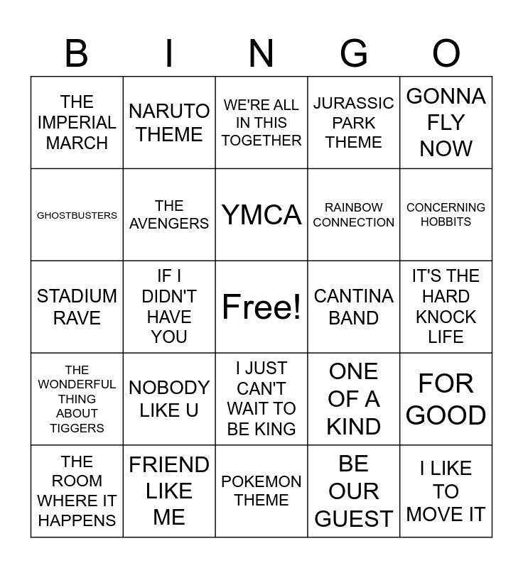 This bingo card has a free space and 33 words: YOU'VE GOT A FRIEND IN ME, THE BARE NECESSITIES, IF I DIDN'T HAVE YOU, FROZEN HEART, THE WONDERFUL THING ABOUT TIGGERS, THE AVENGERS, GONNA FLY NOW, THE ROOM WHERE IT HAPPENS, NARUTO THEME, MISSION IMPOSSIBLE THEME, YMCA, WE'RE ALL IN THIS TOGETHER, THE INCREDIBLES THEME, I'M A BELIEVER, CANTINA BAND, CONCERNING HOBBITS, FRIEND LIKE ME, STADIUM RAVE, NOBODY LIKE U, ONE OF A KIND, I JUST CAN'T WAIT TO BE KING, PROUD CORAZON, THE IMPERIAL MARCH, IT'S THE HARD KNOCK LIFE, POKEMON THEME, I LIKE TO MOVE IT, JURASSIC PARK THEME, RAINBOW CONNECTION, GHOSTBUSTERS, FOR GOOD, HE'S A PIRATE, BE OUR GUEST and TAKEDOWN.