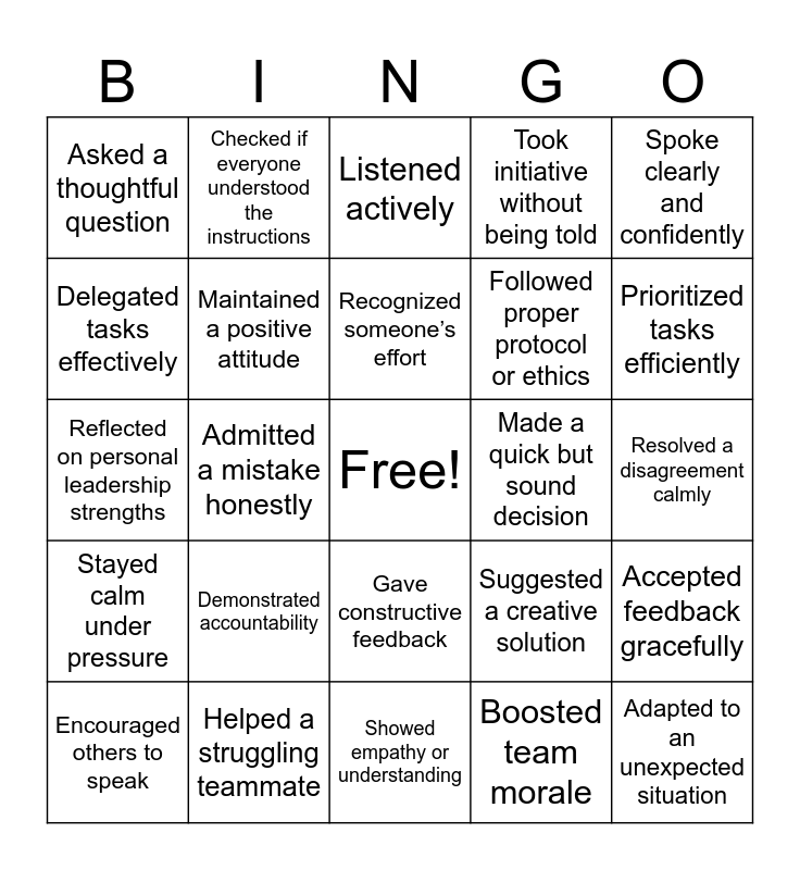 This bingo card has a free space and 24 words: Encouraged others to speak, Demonstrated accountability, Recognized someone’s effort, Boosted team morale, Spoke clearly and confidently, Asked a thoughtful question, Checked if everyone understood the instructions, Listened actively, Made a quick but sound decision, Resolved a disagreement calmly, Reflected on personal leadership strengths, Maintained a positive attitude, Suggested a creative solution, Accepted feedback gracefully, Delegated tasks effectively, Helped a struggling teammate, Showed empathy or understanding, Took initiative without being told, Prioritized tasks efficiently, Stayed calm under pressure, Admitted a mistake honestly, Gave constructive feedback, Followed proper protocol or ethics and Adapted to an unexpected situation.