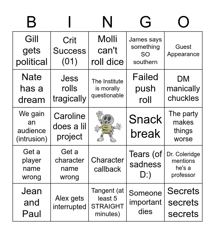 This bingo card has a free space and 30 words: Alex gets interrupted, Auggie crash out, Caroline does a lil project, Dawson sits gayly, Gill gets political, Molli can't roll dice, Jess rolls tragically, Character callback, Snack break, Tangent (at least 5 STRAIGHT minutes), The party makes things worse, Secrets secrets secrets, Someone important dies, Character design update, DM manically chuckles, Tears (of joy :D), Tears (of sadness D:), Get a player name wrong, Get a character name wrong, Guest Appearance, We gain an audience (intrusion), Crit Fail (96-100), Crit Success (01), Failed push roll, Nate has a dream, James says something SO southern, Dr. Coleridge mentions he's a professor, Jean and Paul, The Institute is morally questionable and Statement begins....
