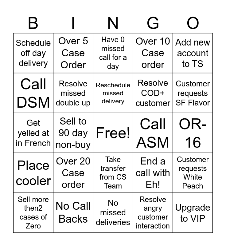This bingo card has a free space and 24 words: Over 20 Case order, No Call Backs, Reschedule missed delivery, Sell more then2 cases of Zero, Add new account to TS, Schedule off day delivery, Call DSM, Over 5 Case Order, Call ASM, Take transfer from CS Team, Resolve COD+ customer, Get yelled at in French, End a call with Eh!, Customer requests White Peach, Resolve missed double up, Resolve angry customer interaction, OR-16, Have 0 missed call for a day, Customer requests SF Flavor, Sell to 90 day non-buy, Upgrade to VIP, Place cooler, Over 10 Case order and No missed deliveries.