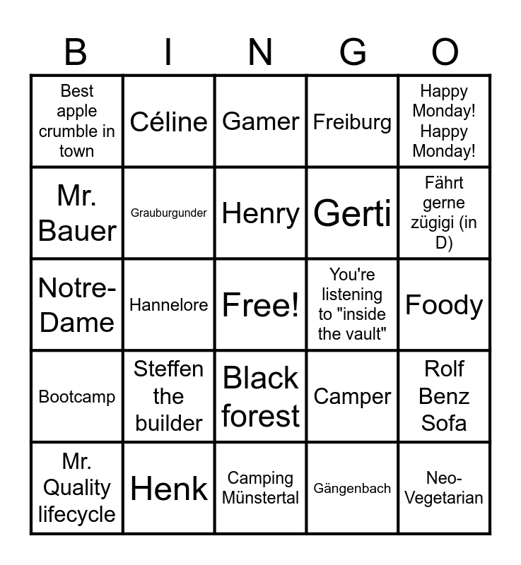 This bingo card has a free space and 24 words: Steffen the builder, Henk, Henry, Mr. Quality lifecycle, Happy Monday! Happy Monday!, Best apple crumble in town, Mr. Bauer, Céline, You're listening to "inside the vault", Black forest, Gerti, Notre-Dame, Camper, Rolf Benz Sofa, Grauburgunder, Gängenbach, Foody, Gamer, Fährt gerne zügigi (in D), Hannelore, Neo-Vegetarian, Bootcamp, Freiburg and Camping Münstertal.