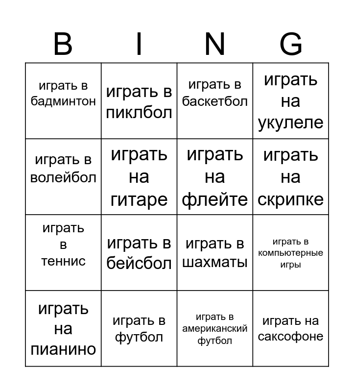 This bingo card has 16 words: играть в футбол, играть в компьютерные игры, играть в баскетбол, играть в бадминтон, играть в теннис, играть в пиклбол, играть в шахматы, играть в американский футбол, играть в волейбол, играть на гитаре, играть на пианино, играть на укулеле, играть в бейсбол, играть на скрипке, играть на флейте and играть на саксофоне.