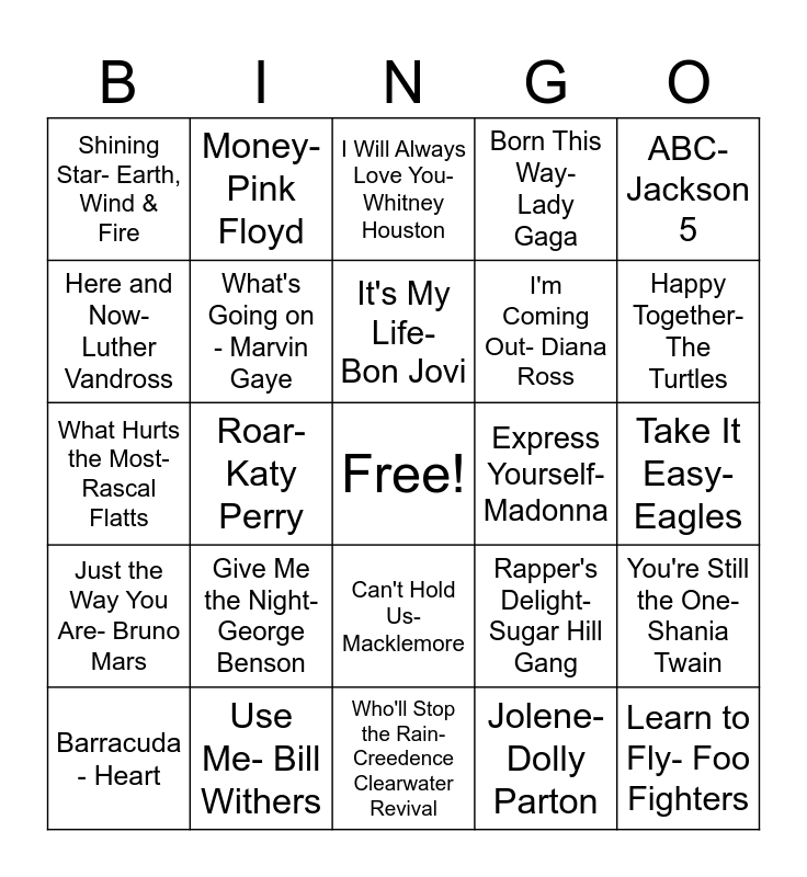 This bingo card has a free space and 39 words: Lose Yourself-Eminem, Dream on - Aerosmith, Isn't She Lovely - Stevie Wonder, What's Going on - Marvin Gaye, Barracuda - Heart, Can't Hold Us- Macklemore, It's My Life- Bon Jovi, On Top of The World- Imagine Dragons, ABC- Jackson 5, Just the Way You Are- Bruno Mars, Roar- Katy Perry, Born This Way- Lady Gaga, Learn to Fly- Foo Fighters, Take It Easy- Eagles, Express Yourself- Madonna, Give Me the Night- George Benson, If You Want Me to Stay- Sly and the Family Stone, Shining Star- Earth, Wind & Fire, Gloria-Laura Branigan, Rapper's Delight- Sugar Hill Gang, Here and Now- Luther Vandross, Who'll Stop the Rain- Creedence Clearwater Revival, I'm Coming Out- Diana Ross, Happy Together- The Turtles, Girl on Fire- Alicia Keys, Just My Imagination- The Temptations, All Along the Watchtower- Jimi Hendrix, The Boxer- Simon & Garfield, Don't Stop Me Now- Queen, Money- Pink Floyd, The Twist- Chubby Checker, Smooth- Santana ft. Rob Thomas, I Will Always Love You- Whitney Houston, Use Me- Bill Withers, Jolene- Dolly Parton, Breathe- Faith Hill, You're Still the One- Shania Twain, What Hurts the Most- Rascal Flatts and California Love- Tupac.