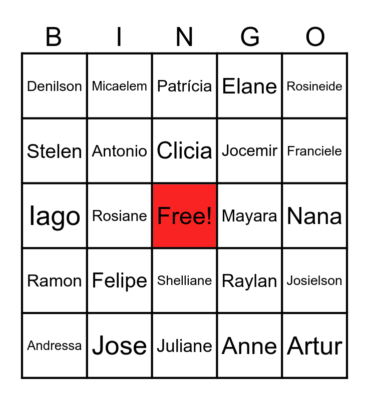 This bingo card has a free space and 27 words: Andressa, Anne, Antonio, Artur, Clicia, Denilson, Elane, Felipe, Franciele, Gabrielle, Iago, Jocemir, Jose, Josielson, Juliane, Keroline, Mayara, Micaelem, Nana, Patrícia, Ramon, Raylan, Rosiane, Rosineide, Shelliane, Stelen and Yago.