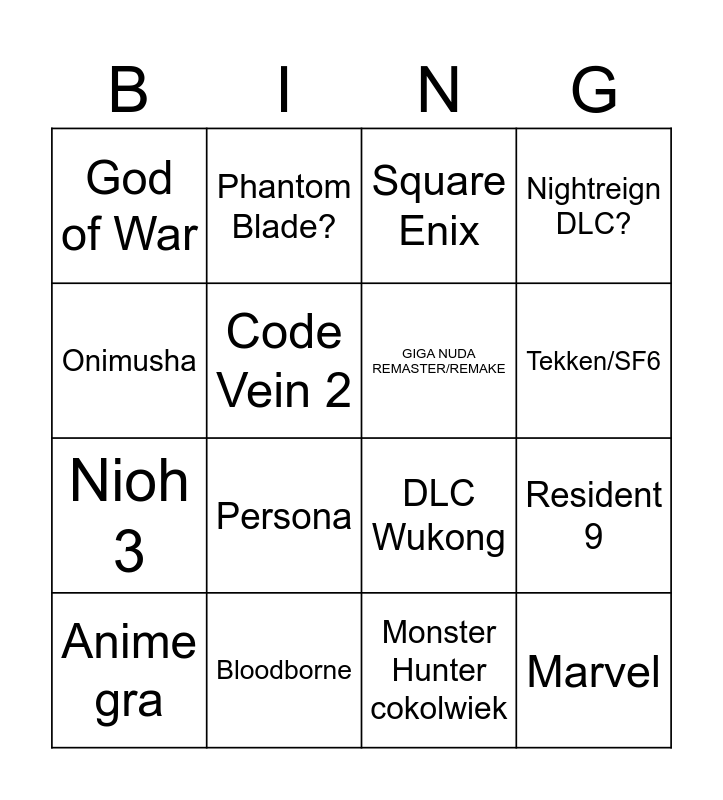 This bingo card has 16 words: Bloodborne, Resident 9, Square Enix, God of War, Nioh 3, Phantom Blade?, DLC Wukong, Monster Hunter cokolwiek, Onimusha, Code Vein 2, Anime gra, Nightreign DLC?, Persona, Tekken/SF6, GIGA NUDA REMASTER/REMAKE and Marvel.