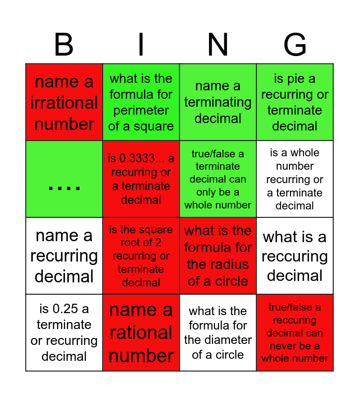 This bingo card has 16 words: name a rational number, what is a reccuring decimal, name a terminating decimal, name a irrational number, name a recurring decimal, what is the formula for perimeter of a square, what is the formula for the radius of a circle, what is the formula for the diameter of a circle, ...., is 0.3333... a recurring or a terminate decimal, is 0.25 a terminate or recurring decimal, is pie a recurring or terminate decimal, is the square root of 2 recurring or terminate decimal, is a whole number recurring or a terminate decimal, true/false a terminate decimal can only be a whole number and true/false a reccuring decimal can never be a whole number.