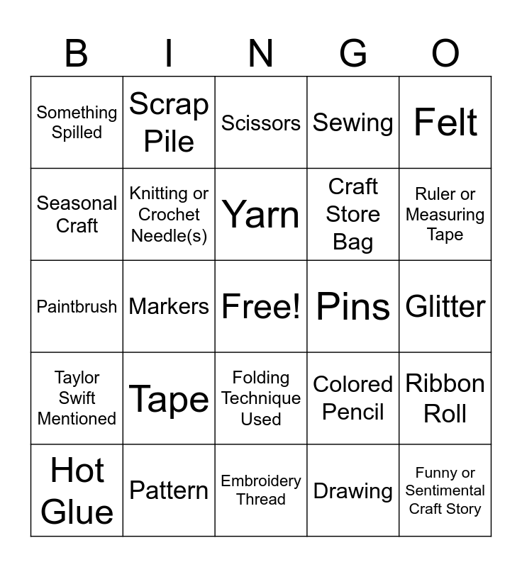 This bingo card has a free space and 29 words: Hot Glue, Nature Craft, Markers, Unfinished Project, Something Spilled, Scissors, Knitting or Crochet Needle(s), Tape, Pins, Pattern, Glitter, Funny or Sentimental Craft Story, Embroidery Thread, Drawing, Ruler or Measuring Tape, Threading a Needle, Folding Technique Used, Taylor Swift Mentioned, Felt, Paintbrush, Colored Pencil, You responded to the Ice Breaker, Craft Store Bag, Seasonal Craft, Sewing, Scrap Pile, Ribbon Roll, Yarn and Oh No!.