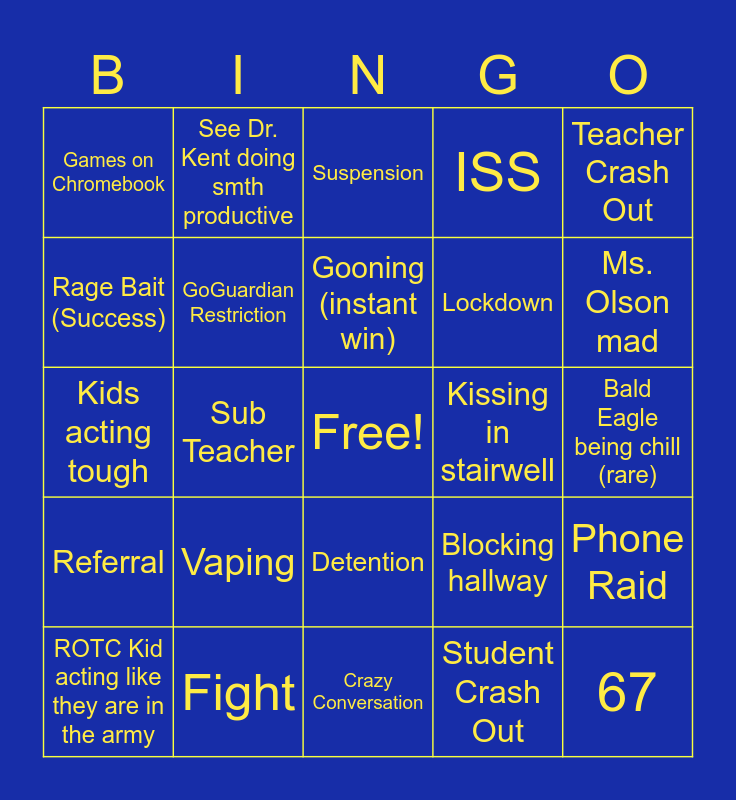 This bingo card has a free space and 24 words: Vaping, Fight, Gooning (instant win), ROTC Kid acting like they are in the army, Teacher Crash Out, Games on Chromebook, Rage Bait (Success), See Dr. Kent doing smth productive, Kissing in stairwell, Detention, Lockdown, Kids acting tough, Blocking hallway, Phone Raid, GoGuardian Restriction, Student Crash Out, Bald Eagle being chill (rare), Suspension, Ms. Olson mad, Sub Teacher, 67, Referral, ISS and Crazy Conversation.