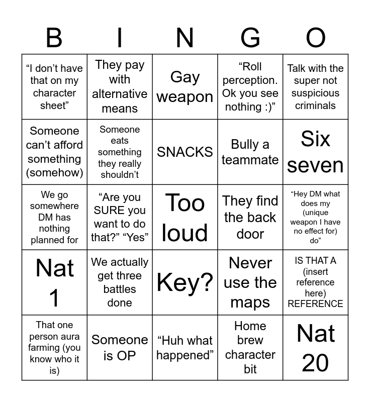 This bingo card has a free space and 24 words: We actually get three battles done, Someone is OP, SNACKS, That one person aura farming (you know who it is), Talk with the super not suspicious criminals, “I don’t have that on my character sheet”, Someone can’t afford something (somehow), They pay with alternative means, They find the back door, Key?, Bully a teammate, We go somewhere DM has nothing planned for, Never use the maps, IS THAT A (insert reference here) REFERENCE, Someone eats something they really shouldn’t, Home brew character bit, “Hey DM what does my (unique weapon I have no effect for) do”, Gay weapon, Six seven, “Are you SURE you want to do that?” “Yes”, Nat 20, Nat 1, “Roll perception. Ok you see nothing :)” and “Huh what happened”.