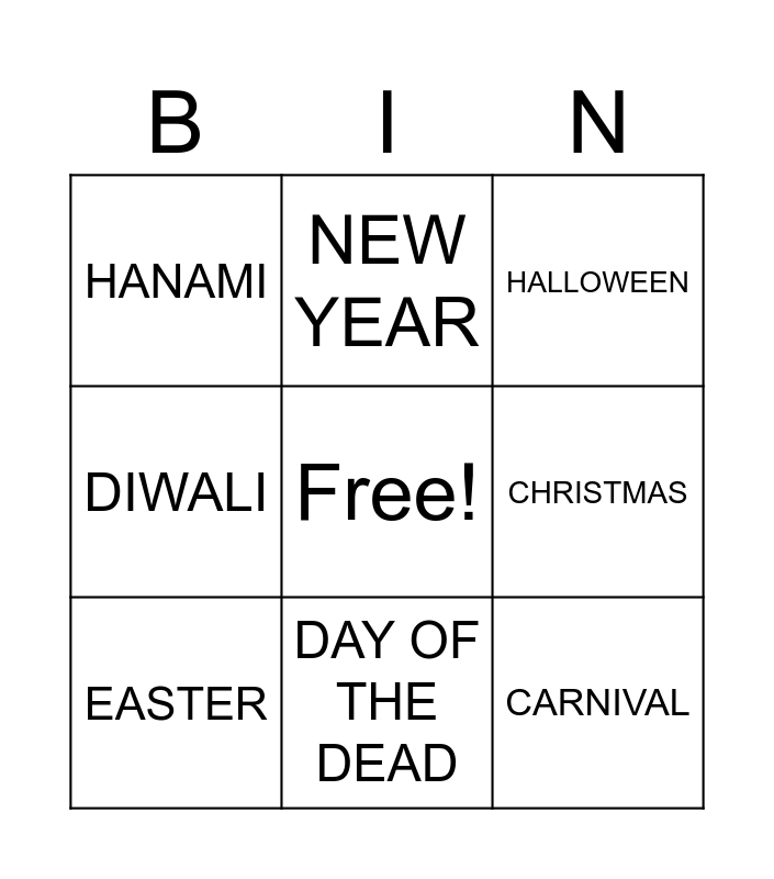 This bingo card has a free space and 8 words: CHRISTMAS, HALLOWEEN, NEW YEAR, EASTER, HANAMI, CARNIVAL, DIWALI and DAY OF THE DEAD.
