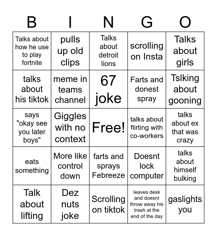 This bingo card has a free space and 24 words: More like control down, Dez nuts joke, 67 joke, Talk about lifting, Talks about girls, Talks about how he use to play fortnite, talks about his tiktok, pulls up old clips, talks about flirting with co-workers, farts and sprays Febreeze, Farts and donest spray, says "okay see you later boys", Doesnt lock computer, talks about himself bulking, meme in teams channel, leaves desk and doesnt throw away his trash at the end of the day, talks about ex that was crazy, Talks about detroit lions, Tslking about gooning, Giggles with no context, gaslights you, eats something, scrolling on Insta and Scrolling on tiktok.