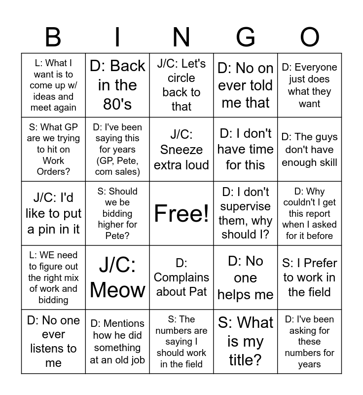 This bingo card has a free space and 24 words: J/C: Meow, D: Mentions how he did something at an old job, J/C: Sneeze extra loud, D: No one ever listens to me, D: Everyone just does what they want, L: What I want is to come up w/ ideas and meet again, S: What GP are we trying to hit on Work Orders?, D: Back in the 80's, D: I don't supervise them, why should I?, D: Complains about Pat, D: I don't have time for this, J/C: I'd like to put a pin in it, D: No one helps me, S: I Prefer to work in the field, D: I've been saying this for years (GP, Pete, com sales), S: What is my title?, D: Why couldn't I get this report when I asked for it before, J/C: Let's circle back to that, D: The guys don't have enough skill, S: Should we be bidding higher for Pete?, D: I've been asking for these numbers for years, L: WE need to figure out the right mix of work and bidding, D: No on ever told me that and S: The numbers are saying I should work in the field.