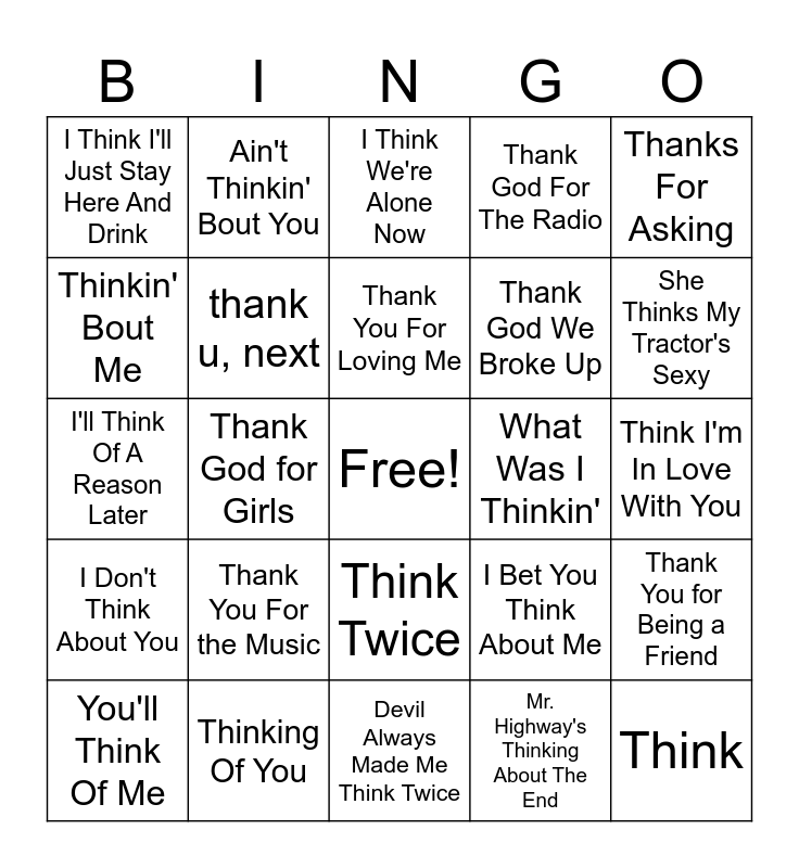 This bingo card has a free space and 38 words: Thank God, Thnks fr the Mmrs, Thank God I'm a Country Boy, thank u, next, Thank You for Being a Friend, Thank You For the Music, Thank You For Loving Me, Thank God I Found You, Thanks For Asking, Thank God We Broke Up, Thank God for Girls, Thank God For The Radio, Think, Think I'm In Love With You, Thinkin' Bout Me, I Don't Think About You, Thinking out Loud, I Think We're Alone Now, Thinking 'Bout Love, What Was I Thinkin', I Think I'll Just Stay Here And Drink, Thinking Of You, She Thinks My Tractor's Sexy, You'll Think Of Me, Thinkin' Problem, Devil Always Made Me Think Twice, Don't Think I Don't Think About It, Think I'm In Love, Da Ya Think I'm Sexy?, Think Like A Man, You Might Think, Think Twice, Mr. Highway's Thinking About The End, Ain't Thinkin' Bout You, I Think I'm Paranoid, I Bet You Think About Me, I'll Think Of A Reason Later and When I Think Of You.