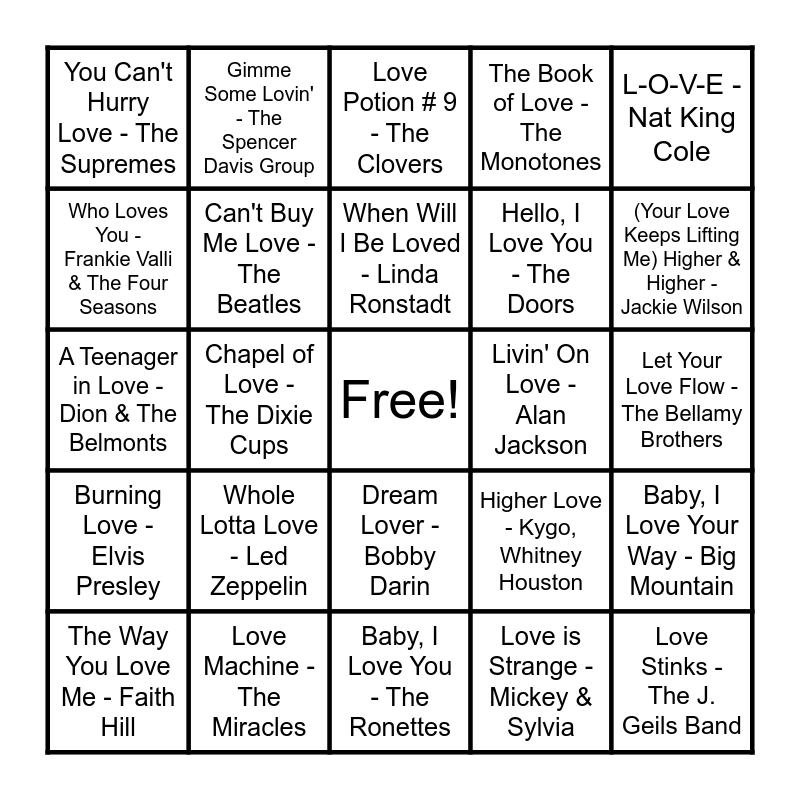 This bingo card has a free space and 24 words: Whole Lotta Love - Led Zeppelin, Love Machine - The Miracles, When Will I Be Loved - Linda Ronstadt, The Way You Love Me - Faith Hill, L-O-V-E - Nat King Cole, You Can't Hurry Love - The Supremes, Who Loves You - Frankie Valli & The Four Seasons, Gimme Some Lovin' - The Spencer Davis Group, Livin' On Love - Alan Jackson, Dream Lover - Bobby Darin, Hello, I Love You - The Doors, A Teenager in Love - Dion & The Belmonts, Higher Love - Kygo, Whitney Houston, Baby, I Love Your Way - Big Mountain, Can't Buy Me Love - The Beatles, Love is Strange - Mickey & Sylvia, Let Your Love Flow - The Bellamy Brothers, Love Potion # 9 - The Clovers, (Your Love Keeps Lifting Me) Higher & Higher - Jackie Wilson, Chapel of Love - The Dixie Cups, Love Stinks - The J. Geils Band, Burning Love - Elvis Presley, The Book of Love - The Monotones and Baby, I Love You - The Ronettes.