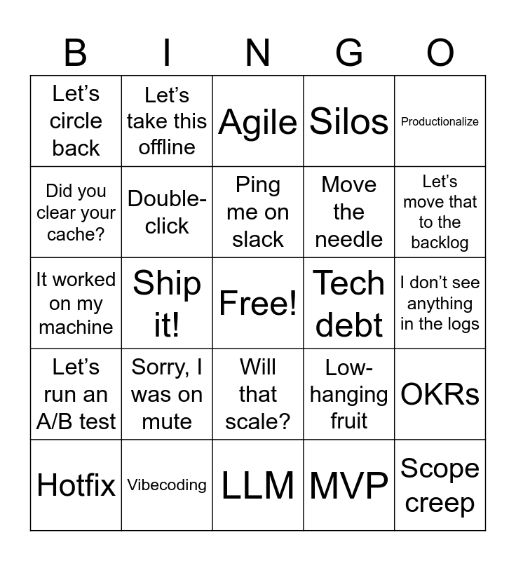 This bingo card has a free space and 24 words: Sorry, I was on mute, Vibecoding, Ping me on slack, Hotfix, Productionalize, Let’s circle back, Did you clear your cache?, Let’s take this offline, Tech debt, Will that scale?, Move the needle, It worked on my machine, Low-hanging fruit, OKRs, Double-click, MVP, I don’t see anything in the logs, Agile, Let’s move that to the backlog, Ship it!, Scope creep, Let’s run an A/B test, Silos and LLM.
