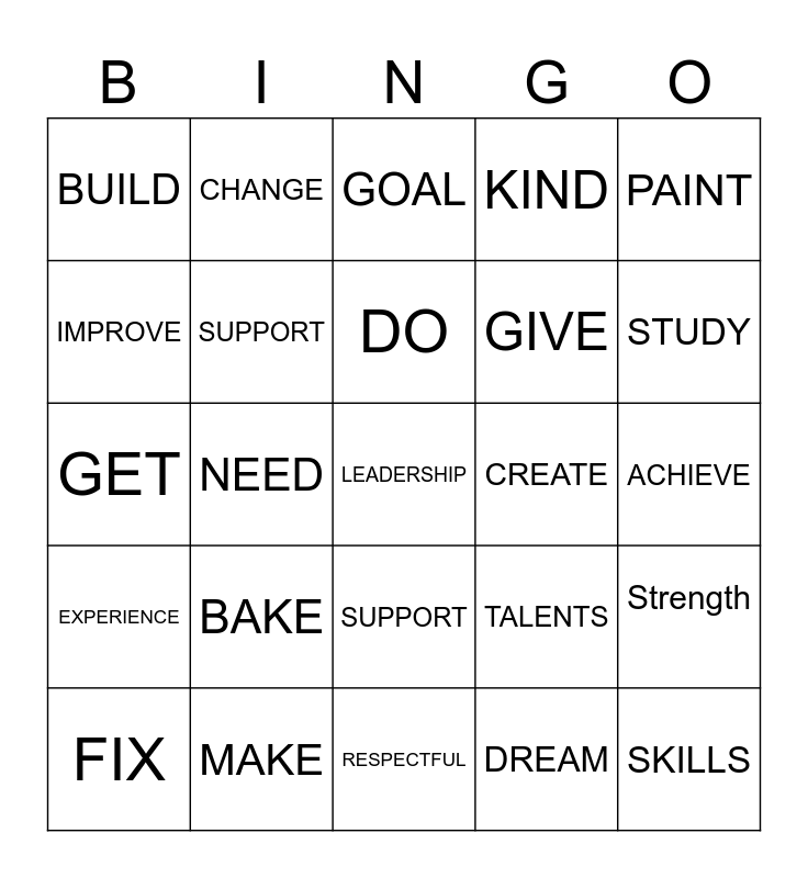 This bingo card has a free space and 24 words: BAKE, MAKE, DO, FIX, PAINT, BUILD, IMPROVE, CHANGE, CREATE, SUPPORT, GIVE, GET, TALENTS, Strength, SUPPORT, DREAM, ACHIEVE, GOAL, STUDY, NEED, SKILLS, EXPERIENCE, KIND and RESPECTFUL.
