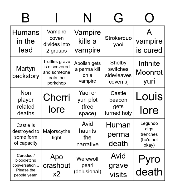 This bingo card has a free space and 24 words: Majorscythe fight, Apo crashout x2, Abolish gets a perma kill on a vampire, Cureduo / bloodletting conversation... Please the people yearn, A vampire is cured, Humans in the lead, Martyn backstory, Vampire coven divides into 2 groups, Castle beacon gets turned holy, Avid haunts the narrative, Shelby switches side/leaves coven :(, Non player related deaths, Human perma death, Legundo digs trenches (he's not okay), Truffles grave is discovered and someone eats the porkchop, Avid grave visits, Louis lore, Vampire kills a vampire, Infinite Moonrot yuri, Cherri lore, Pyro death, Castle is destroyed to some form of capacity, Strokerduo yaoi and Werewolf pearl (delusional).