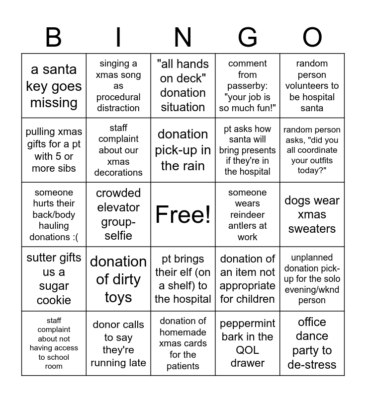 This bingo card has a free space and 24 words: donation of dirty toys, donor calls to say they're running late, donation pick-up in the rain, staff complaint about not having access to school room, random person volunteers to be hospital santa, a santa key goes missing, pulling xmas gifts for a pt with 5 or more sibs, singing a xmas song as procedural distraction, someone wears reindeer antlers at work, pt brings their elf (on a shelf) to the hospital, pt asks how santa will bring presents if they're in the hospital, someone hurts their back/body hauling donations :(, donation of an item not appropriate for children, unplanned donation pick-up for the solo evening/wknd person, staff complaint about our xmas decorations, peppermint bark in the QOL drawer, dogs wear xmas sweaters, "all hands on deck" donation situation, random person asks, "did you all coordinate your outfits today?", crowded elevator group-selfie, office dance party to de-stress, sutter gifts us a sugar cookie, comment from passerby: "your job is so much fun!" and donation of homemade xmas cards for the patients.