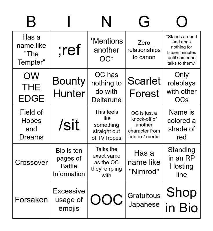 This bingo card has a free space and 24 words: Bio is ten pages of Battle Information, Excessive usage of emojis, OC has nothing to do with Deltarune, Forsaken, *Stands around and does nothing for fifteen minutes until someone talks to them.*, Has a name like "The Tempter", OW THE EDGE, ;ref, OC is just a knock-off of another character from canon / media, Talks the exact same as the OC they're rp'ing with, Scarlet Forest, Field of Hopes and Dreams, Has a name like "Nimrod", Standing in an RP Hosting line, Bounty Hunter, Gratuitous Japanese, Name is colored a shade of red, *Mentions another OC*, Only roleplays with other OCs, /sit, Shop in Bio, Crossover, Zero relationships to canon and OOC.